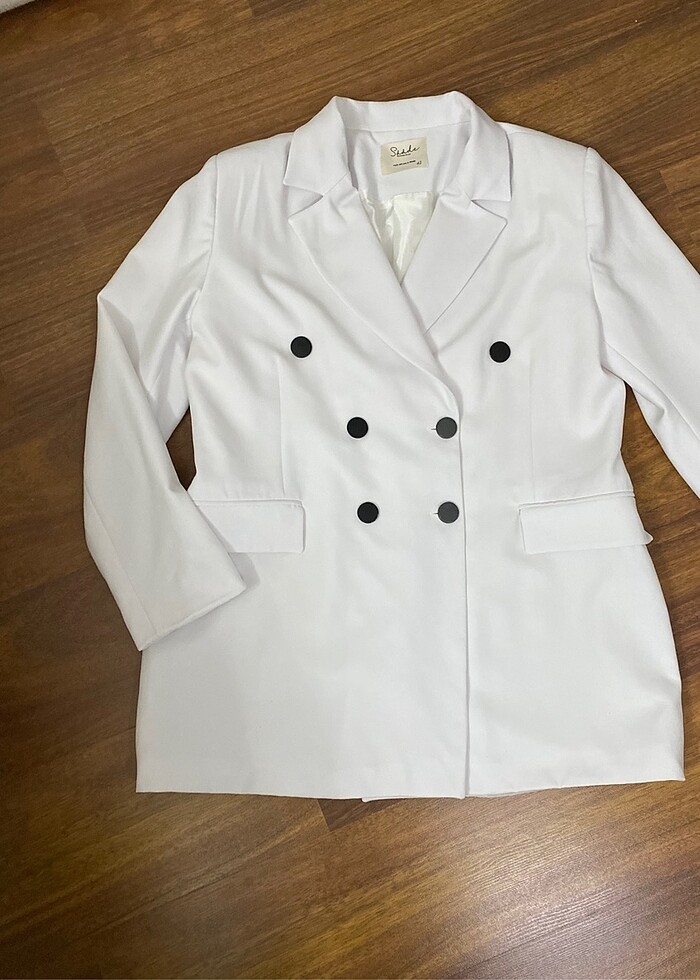 Çok şık duruşu olan beyaz renk 1 kez kulanılmış sıfır konumda esnek çeket 42 beden fakat 44 bedeninde rahatça kulanabileceği bi ceket marka temsilidir markası saade!!!