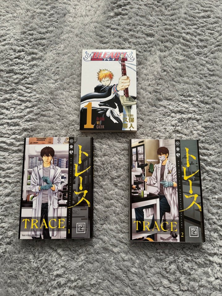 toplu satıyorum Bir adet Bleach manga ve iki adet Trace manga kitabından oluşan set. Bleach kapağında kılıç tutan karakter, Trace kapaklarında laboratuvar ortamı yer alıyor.