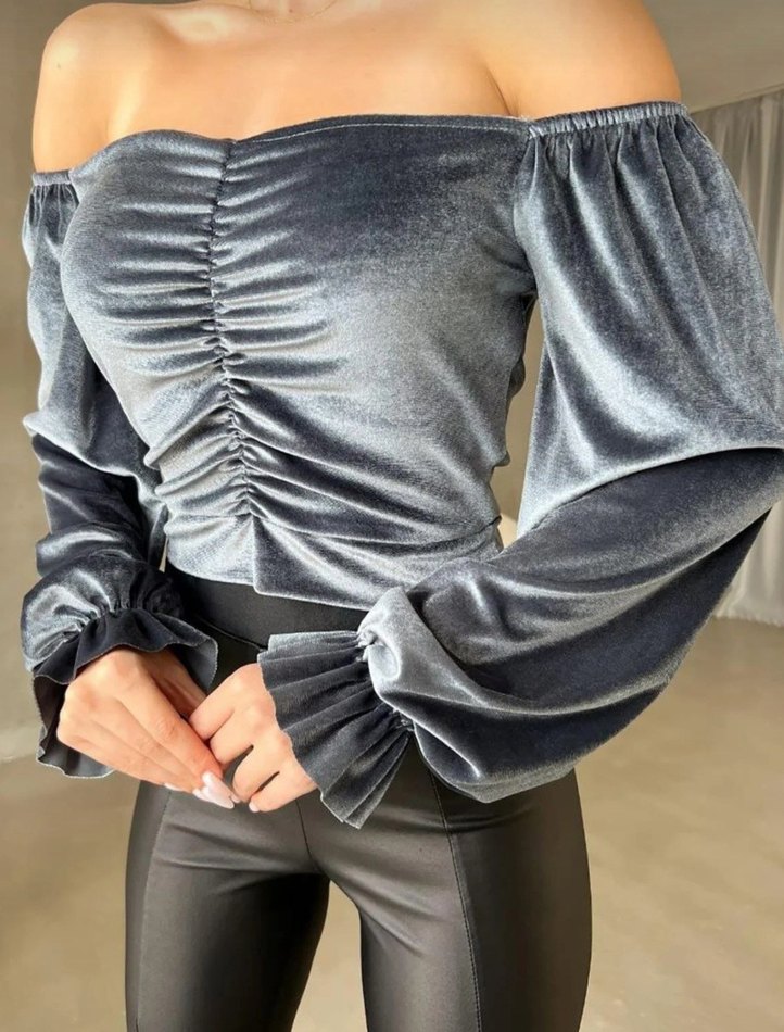 Kadife gümüş renkli kadın bluz etikstli s m l bedenler tercih edebilir