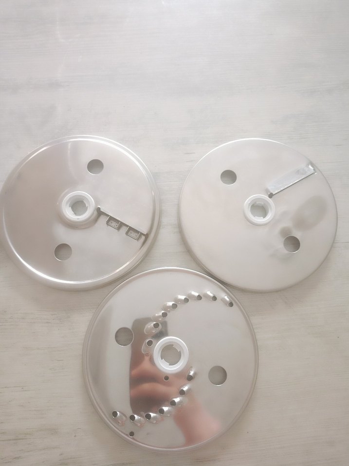 Beyaz ve gri renkte, farklı bıçak düzenlerine sahip üç adet blender dilimleme diski seti.