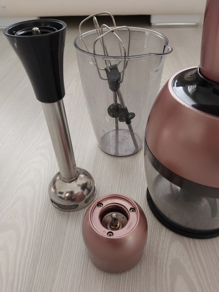 , paslanmaz çelik bıçaklı çok fonksiyonlu el blenderı, şeffaf karıştırma kabı ve çırpıcı aparatları içerir. kasesinde çatlak var görselde görünüyor diğer aparatları yepyeni