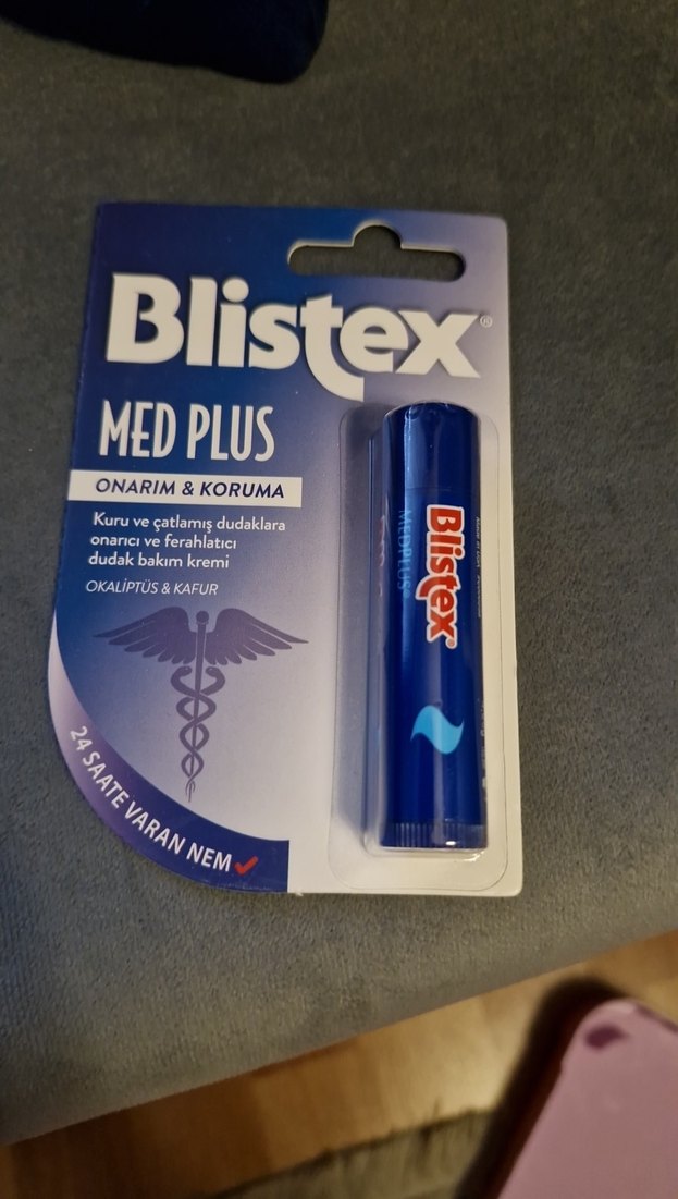 Blistex Med Plus dudak kremi, okaliptus ve kafur içeriğiyle kuru ve çatlamış dudakları onarır ve ferahlatır, 24 saate kadar nem sağlar.