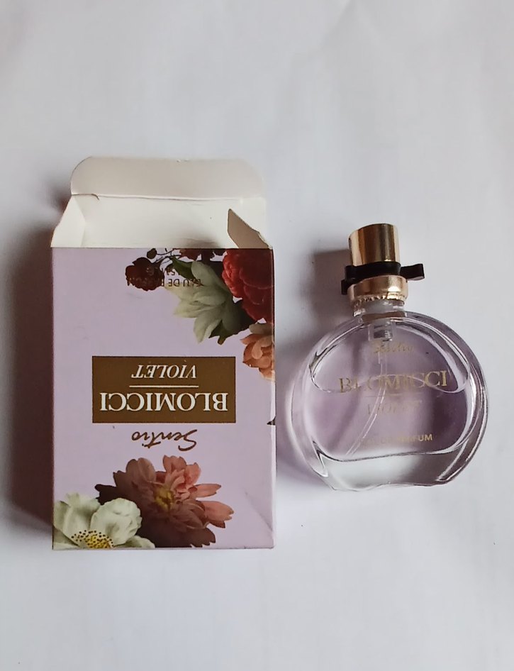 Blomıcci Violet kadın parfümü, çiçek desenli kutusu ve altın kapaklı şeffaf cam şişesiyle 15 ml boyutundadır.