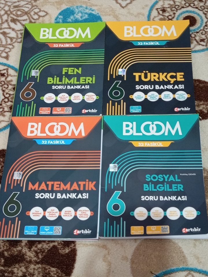 Bloom 6. sınıf Fen, Türkçe, Matematik ve Sosyal Bilgiler soru bankası seti, her biri 32 fasikül içerir. Hiçbiri çözülmedi.