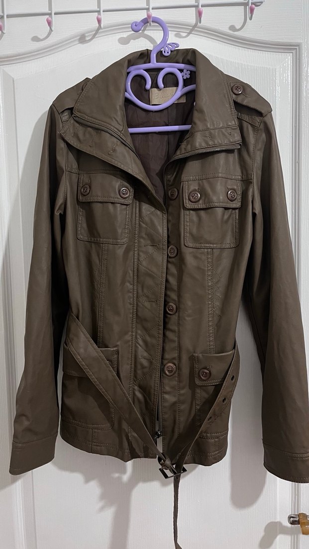 Haki deri, kemerli ve düğmeli cepli, normal boyda kadın ceket. Notlu yaka ve uzun kolludur, günlük rahat kullanıma uygundur. %70 P.U %30 polyester