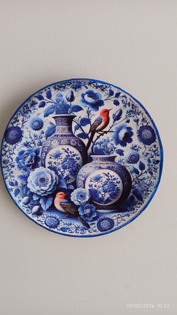20 cm çapında seramik tabak üzerine dekopaj tekniği kullanılarak yapılmıştır. Gıda kullanımına uygun değildir, nemli bir bezle temizleme önerilir.