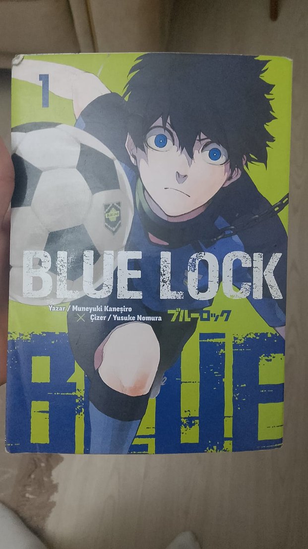 Blue Lock manga 1. cilt, yazar Muneyuki Kaneshiro ve çizer Yusuke Nomura tarafından hazırlanmıştır. Kapakta futbol temalı dinamik bir karakter yer alır. ⚽ hiç bir sorunu yoktur