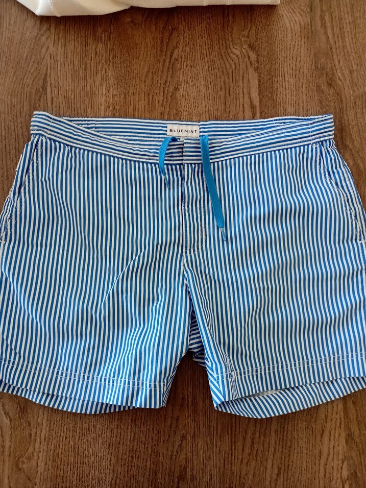 34 beden,m ve l bedenler giyebilir.Mavi beyaz çizgili, kemerli ve mini kesim erkek şort, plaj ve günlük rahat stil için uygundur.