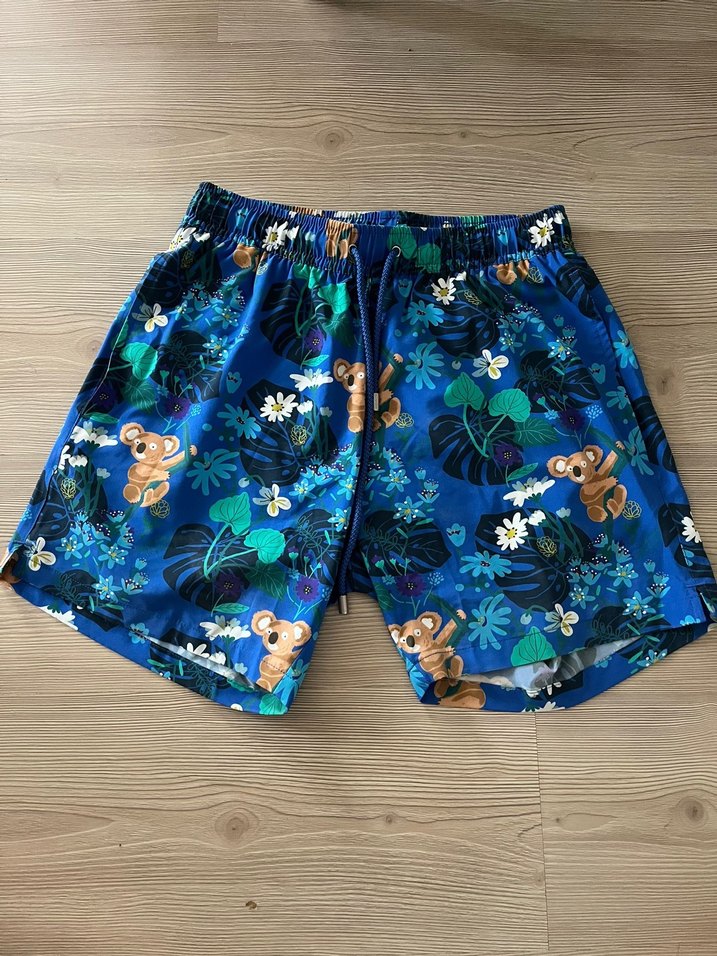 Rahat kesim, düğmeli ve elastik bel bantlı, koala ve tropik yaprak desenli renkli mini erkek mayo şortu. Çok az giyildi