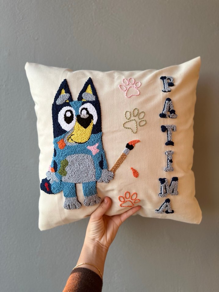 BLUEY temalı ,,tamamen el işlemesi çok renkli kırlent kılıfı. Sevimli köpek bluey ve pati izleri detayları bulunur.