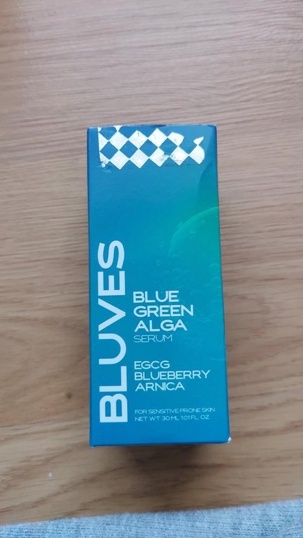 Bluves Mavi Yeşil Alg Serumu, hassas ciltler için EGCG, yaban mersini ve arnika içerir, yaşlanma karşıtı destek sağlar.