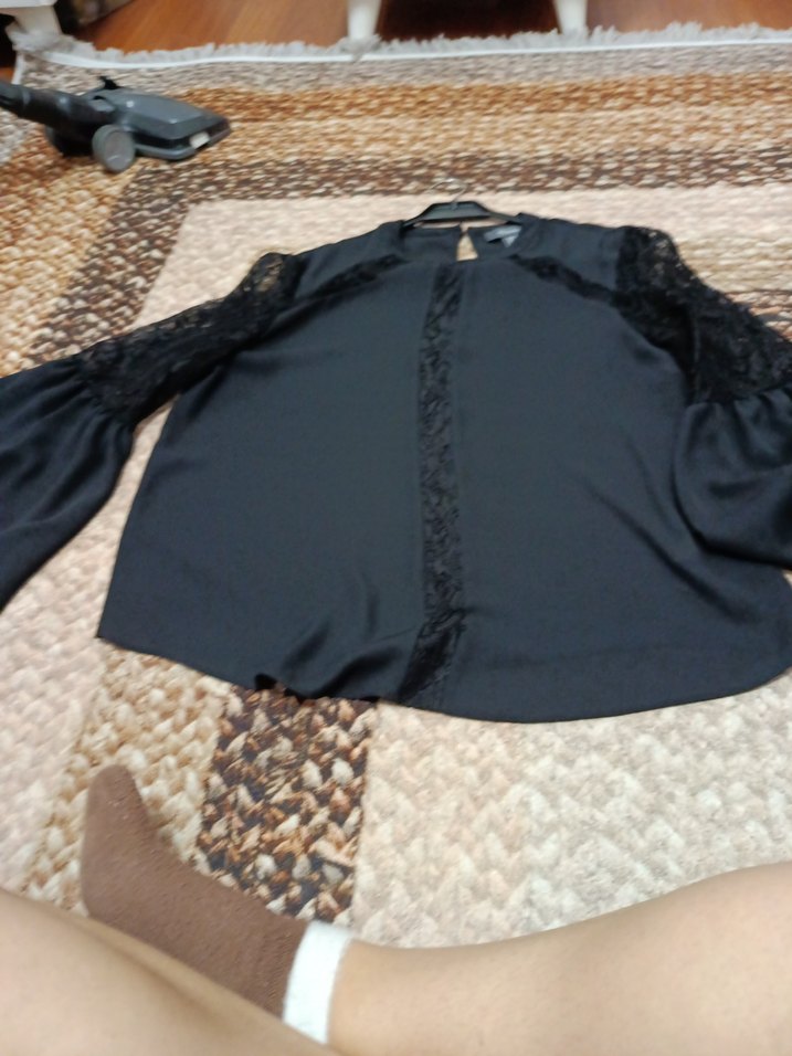 Uzun kollu, dantelli detaylara sahip siyah bluz. V yaka ve bol kesimiyle rahat, ipeksi dokuda günlük kullanıma uygun.