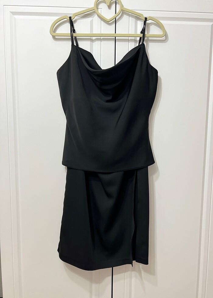 Ürün ikili takım şeklindedir. Bluzu eteğin belinden içeri koyduğunuzda elbise görünümü vermektedir. Etek soldan yırtmaçlı ve soldan hafif drapelidir. Bluz degaje yaka. Bluzun arkasında son fotoğraftaki gibi iplik çekilmesi olmuş 2 yerde, çok zor belli oluyor yok denecek kadar. Bluz s beden, etek m bedendir; bence etek de s bedene daha uygun olur. Kumaş türünü bilemiyorum satene benziyor ama parlak değil güzel kaliteli dökümlü bi kumaş. #etek #bluz #elbise #takım #ikilitakım