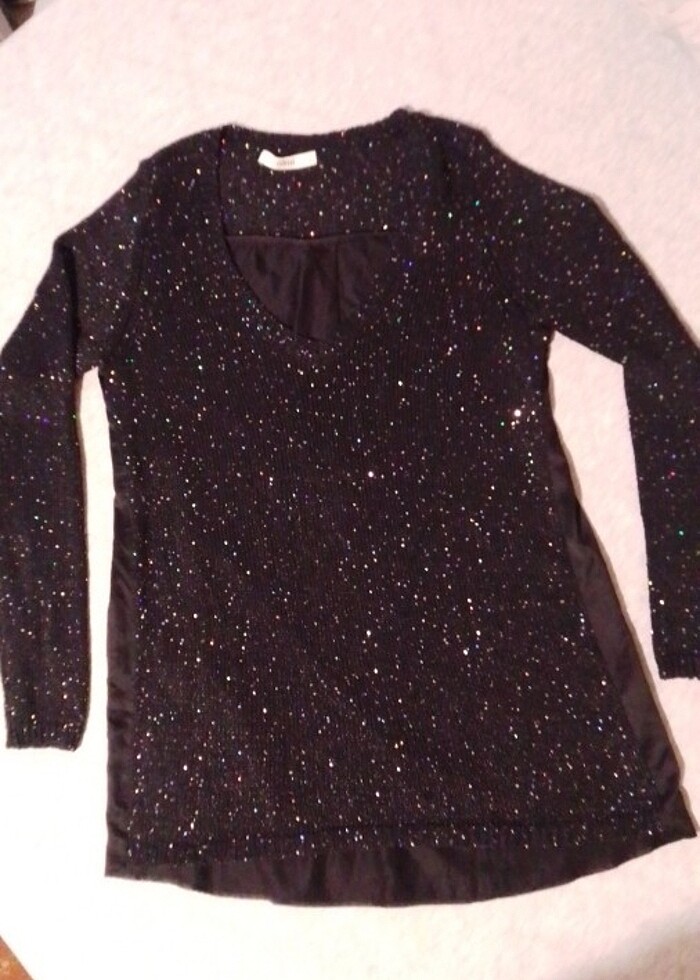 V yakalı. Ön kısmı örme arkası saten kendinden ışıltılı şık bluz.s benden ama m belenlerde rahatlıkla giyebilir.boy 65 cm. kol altı 45 cm