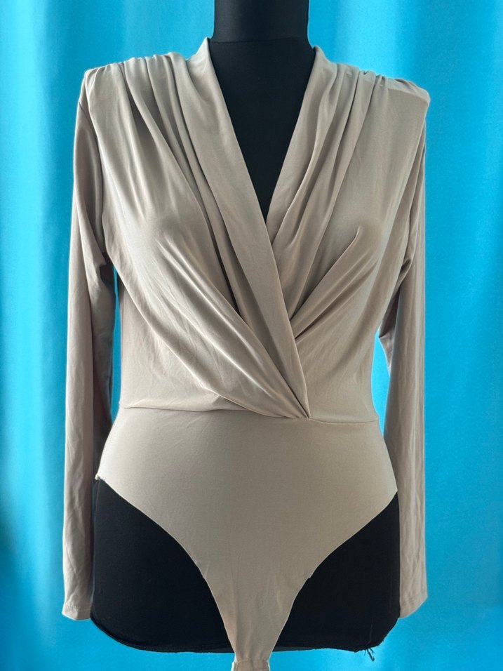 V yaka, drapeli tasarıma sahip bej renkli, uzun kollu ve dar kesim bluz. Günlük kullanıma uygun çağdaş avant-garde stil sunar. M beden