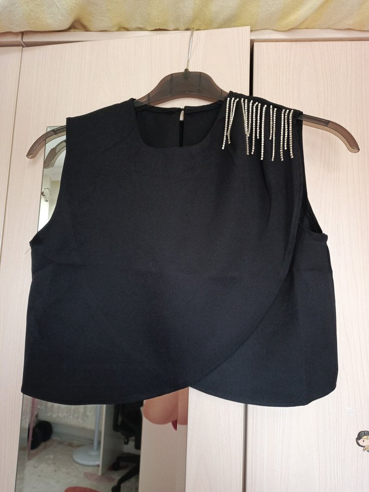 Siyah kolsuz mini yelek, yuvarlak yaka ve drapeli tasarıma sahip, bir omuzda boncuk detayları bulunur, sentetik kumaştan üretilmiştir.