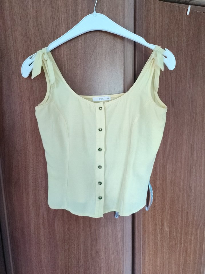 Düğmeli, askılı sarı renk mini bluz vücuda oturan kesime sahip. Günlük rahat sokak stili için uygundur