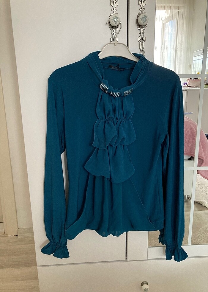 Annem sadece bir kez düğünde giymek için almıştı bir daha hiç giymedi rengi petrol mavisidir, annem 55-60 kilo arası giydi 38-40 beden olan birisi çok rahat giyer.