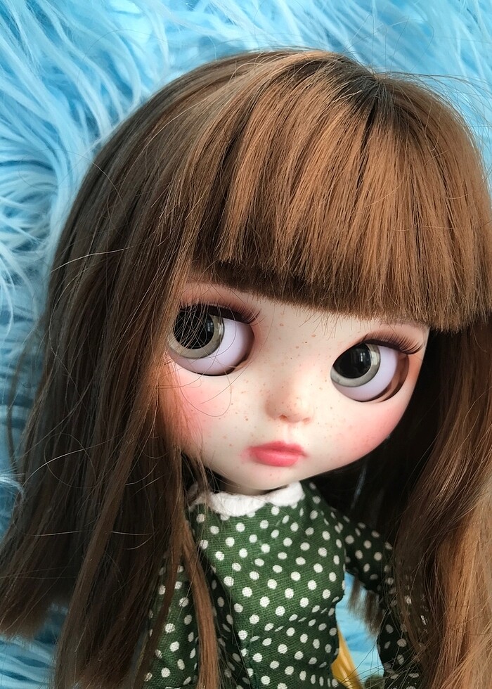 Blythe kolleksiyon bebeği Yüzünü yeniden şekillendirip boyadım. Kirpikleri ipek kirpik ile değiştirdim Boyun aparatı ekledim , böylece kafası sağa sola eğilebiliyor İki takım kıyafet ve oyuncak kurbağası işe göndereceğim. Oyuncak değildir.