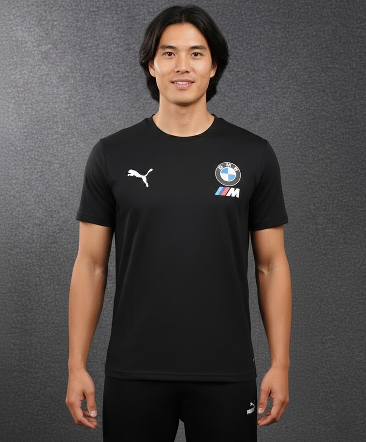 Dar kesim siyah erkek tişörtü, bisiklet yaka ve kısa kolludur. BMW M ve Puma baskıları, velcro detay ile spor şıklık sunar.