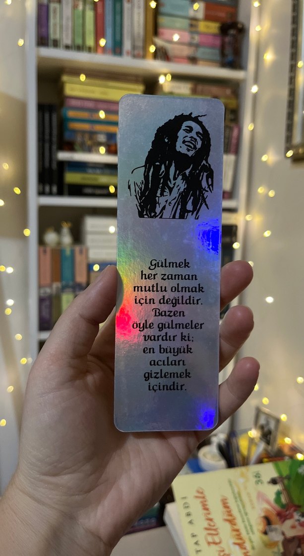 Bob Marley portresi ve anlamlı bir alıntı içeren, holografik yansımaya sahip şeffaf kitap ayracı. Okuma keyfinize renk katar.
