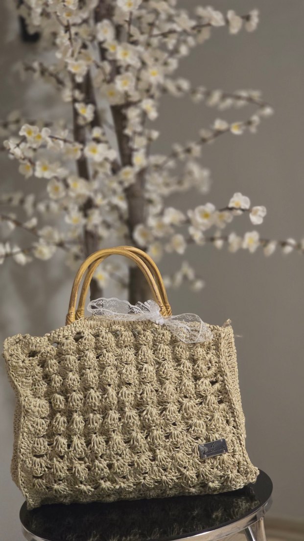 Bej renkli, dantel detaylı ve ahşap saplı örgü kadın çanta. Bohem tarzda, gündelik kullanıma uygun, minimal ve desensiz model. Bodrum hasır ipi ile ince ince örülmüş tahta saplı gündelik hayatta kullanıma uygun klasik tarzda da kullanıma uygun süper bir model