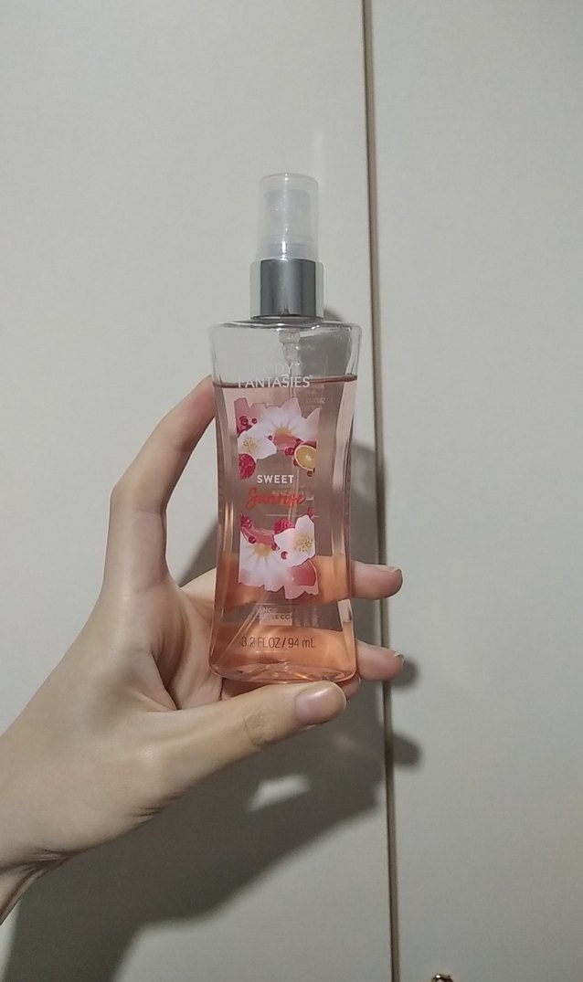 Çiçek desenli, tatlı kokulu kadın parfümü. 94 ml sprey şişede, "SWEE, 02/94" işaretli. çok az kullandım kokudan sıkıldım yere düştü 1 defa fisfis bozuldu ama seyahat şişelerine boşaltıp kullanabilirsiniz ya da yay belki duzelebilir bakmadım