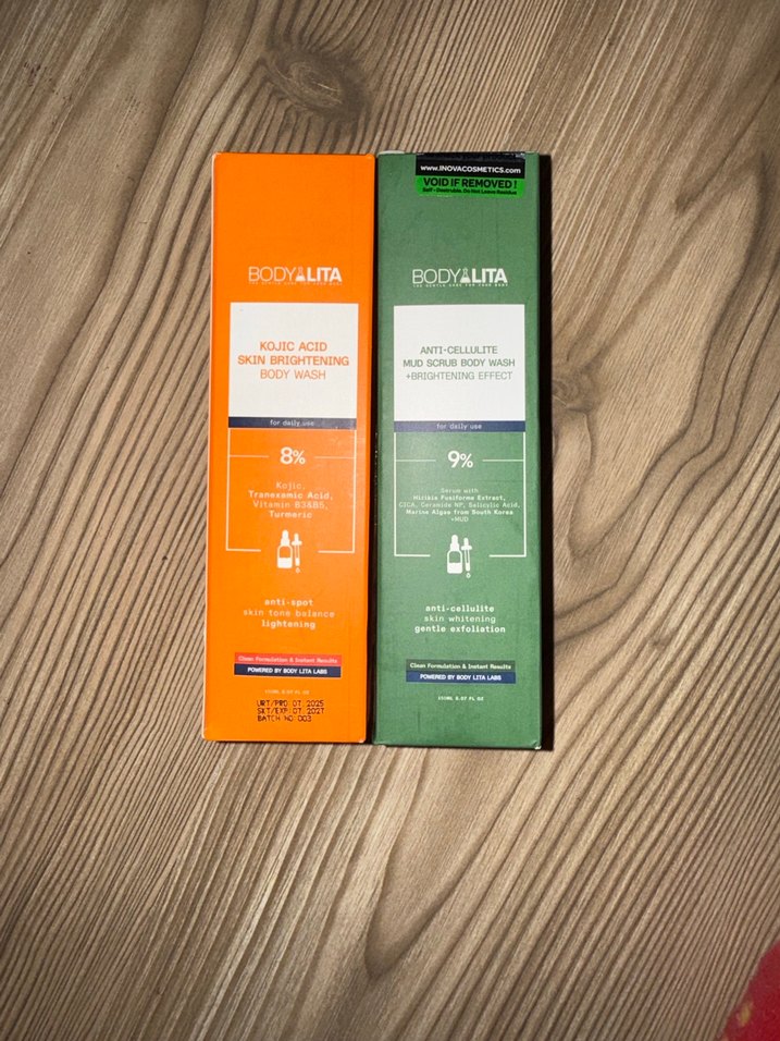 Bodyalita vücut yıkama seti, %8 kojik asit içeren aydınlatıcı ve %9 aktif maddeli selülit karşıtı çamur peelingi içerir. Cildi temizler ve dokusunu iyileştirir.