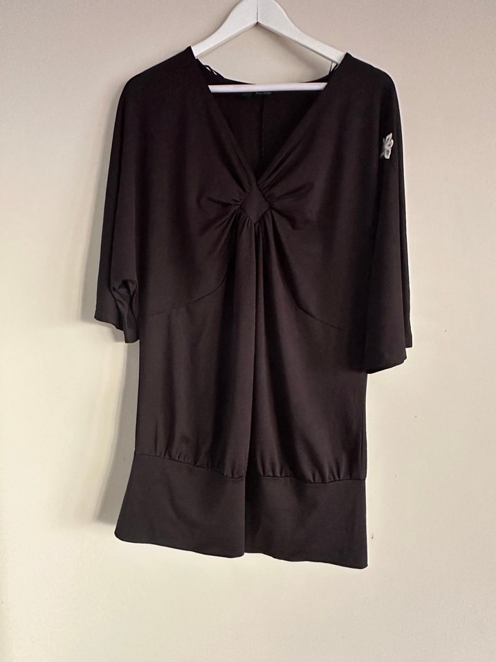Siyah, V yaka, dökümlü hamile bluzu. Yumuşak ve parlak kumaştan, kısa kollu ve midi boyda, romantik akşamlar için uygun. boy-82cm gogus 58cm lycrali BASENE OTURUR esnek sandy kumas