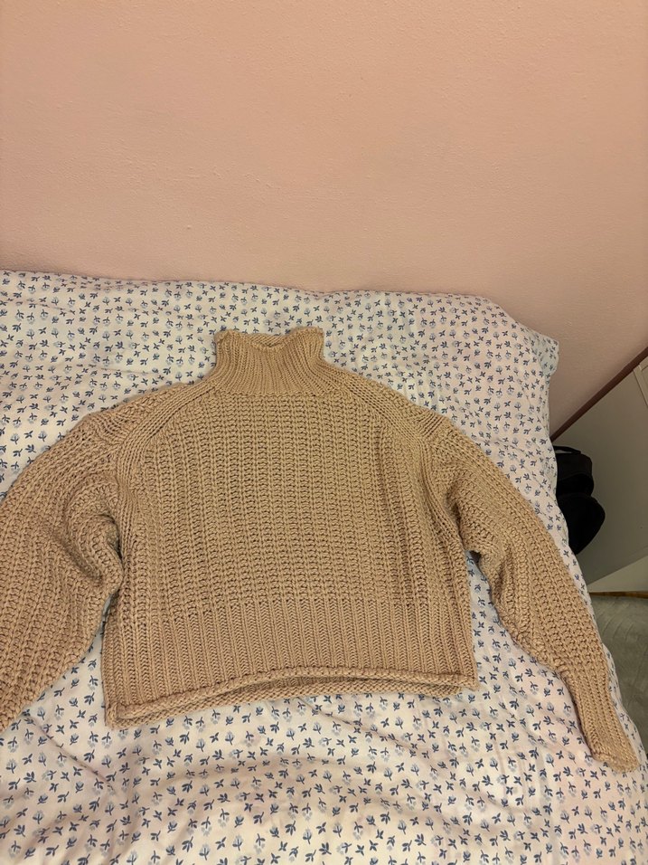 Boğazlı, uzun kollu, bol kesim ve normal uzunlukta kahverengi örgü kadın kazak, rahat sokak stili için uygundur. kalıbı boldur.s-m bedene de olur.