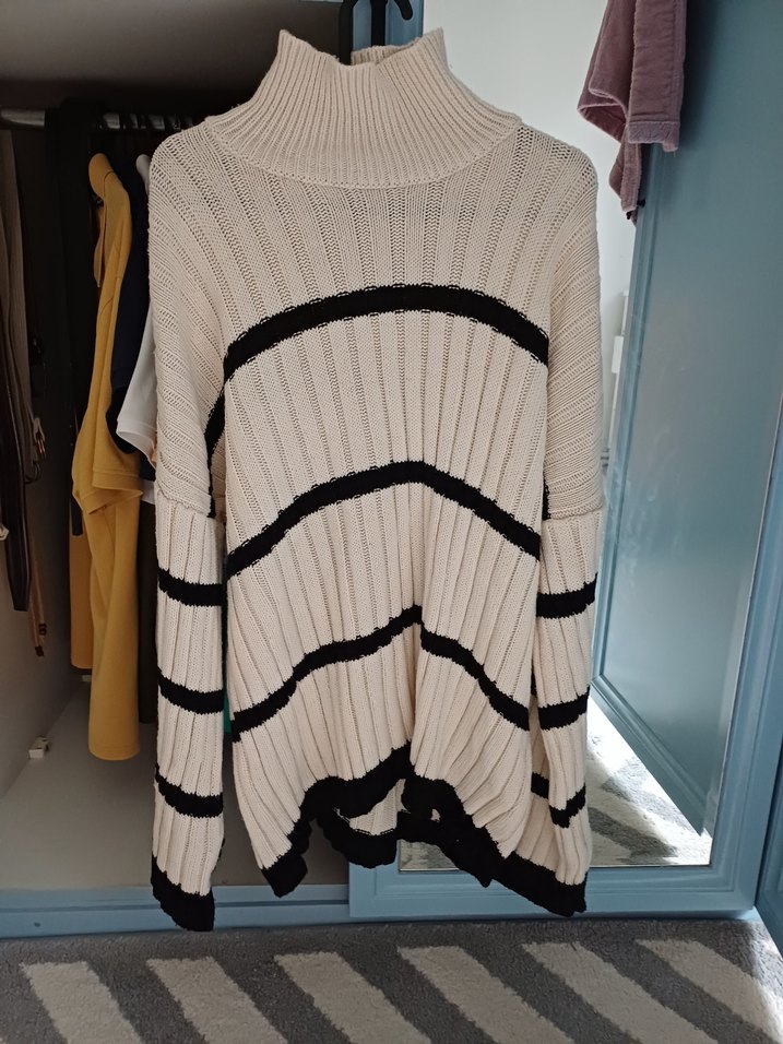 Boğazlı ve uzun kollu, bej renkli örgü kazak. Gevşek ve midi boy, çizgili deseniyle rahat ve trend bir günlük stil sunar.