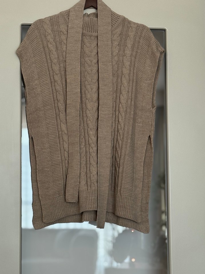 Bej renkli, boğazlı ve kolsuz örgü süveter, normal boy ve rahat kesimle günlük kullanıma uygundur.