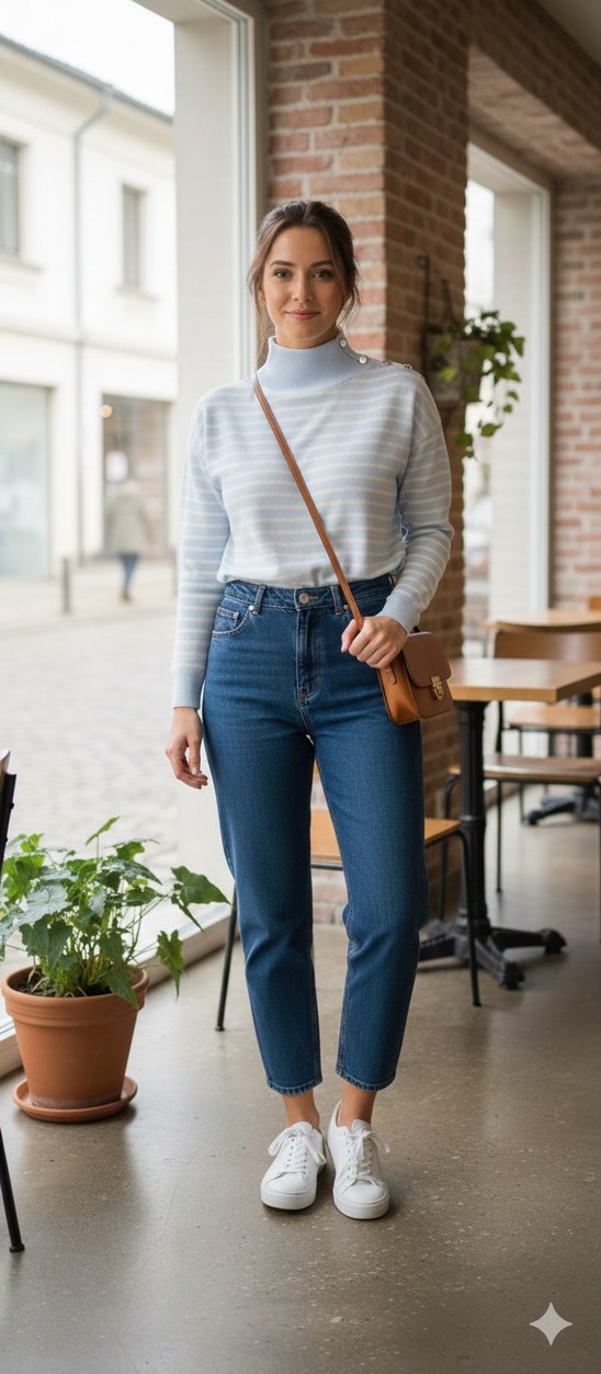 Gri çizgili, boğazlı ve uzun kollu, yumuşak denim görünümlü kumaştan yapılmış kazak. Günlük kullanım için rahat ve şık bir seçenektir. yıkandı ama kullanılmadı