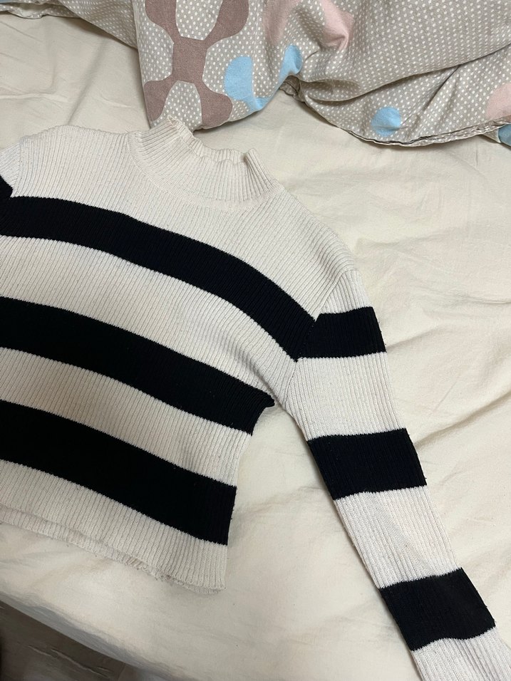 Boğazlı, uzun kollu ve çizgili desenli, beyaz-siyah renklerde örme, rahat kesim kadın kazak. Günlük kullanıma uygun, şık ve sıcak tutar. Tek omuzunda defo var fotoğrafta gösterdim.