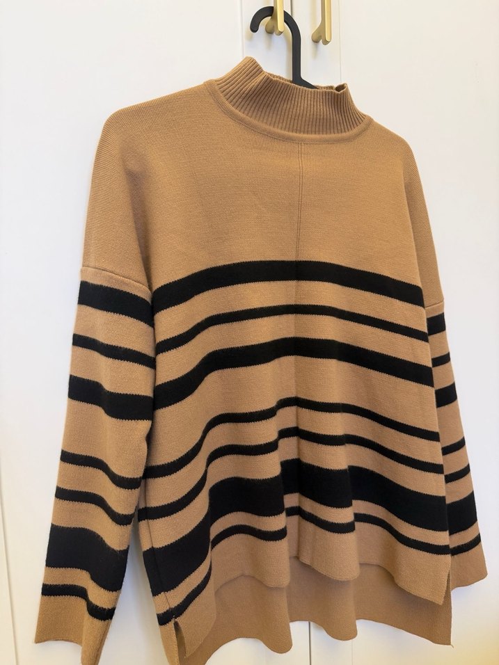 Kahverengi, siyah çizgili, boğazlı ve uzun kollu triko kazak. Yumuşak yün kumaştan, rahat ve günlük kullanım için uygun.yeni gibi standart bedendir