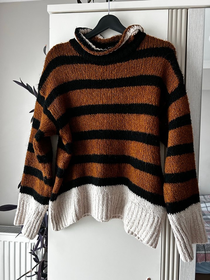 Boğazlı, uzun kollu ve çizgili desenli, kahverengi-siyah-gri tonlarında, rahat kesimli kadın kazak. Günlük sokak stiline uygundur.
