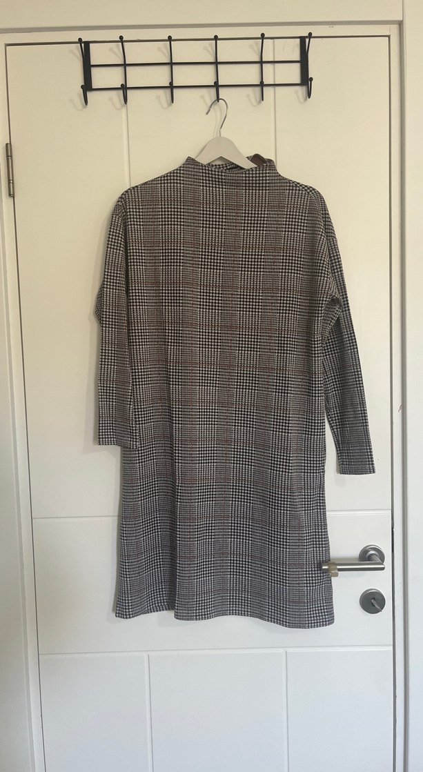 Gri ekose desenli triko elbise, boğazlı ve uzun kolludur. Yumuşak keten kumaştan üretilmiş,rahat kesimlidir.