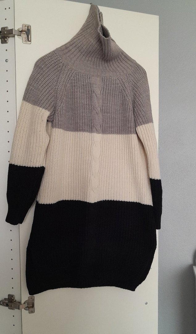 örgü kumaştan, boğazlı ve uzun kollu, gri, krem ve siyah renk bloklu. sadece 1 kez giyebildim sonra kilo aldım kaldı, renklerinde solma vs. yoktur. !! İADE YOKTUR !!