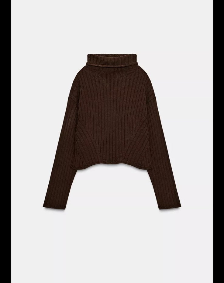 Kahverengi, boğazlı veuzun kollu kısa kazak. Günlük kullanıma uygun sade ve rahat şıklık sunar. Tek sefer kullanıldı yeni gibi