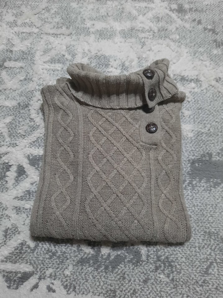 Gri örgü kumaştan, düğmeli boğazlı ve bol kesim günlük sokak stili kadın kazak.