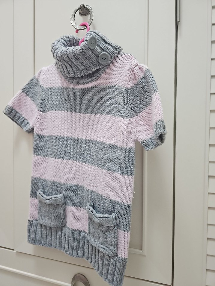Boğazlı, düğmeli kısa kollu, gri-pembe çizgili, bol kesim, iki cepli örgü kazak. Rahat ve günlük sokak stili için uygundur.
