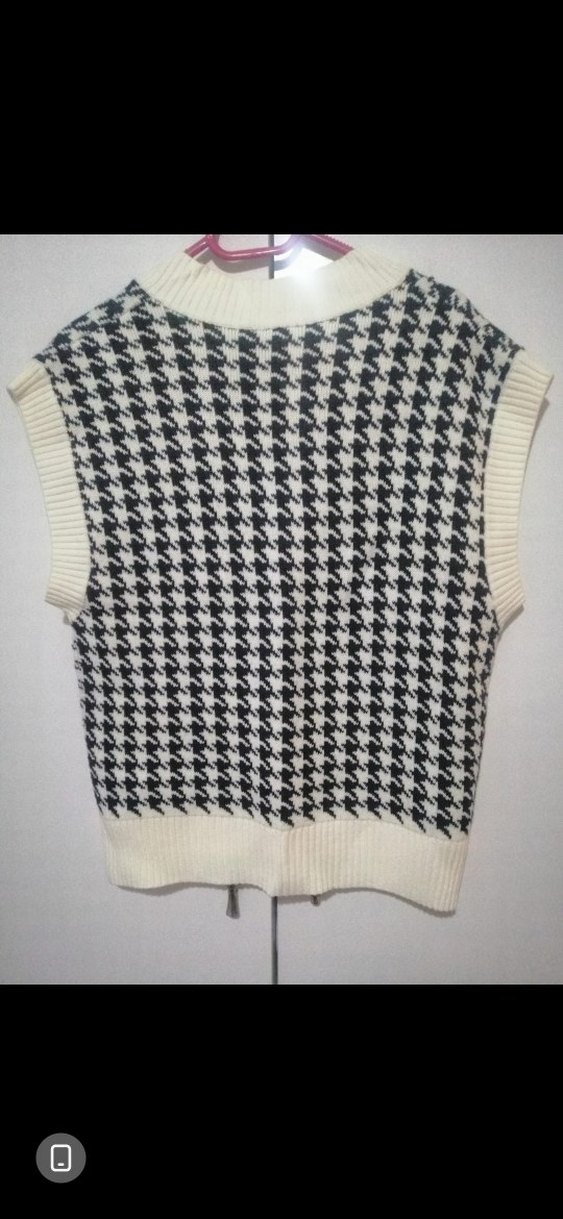 Boğazlı, kolsuz ve gevşek kesim örgü süveter. Siyah beyaz kazayağı desenli, rahat sokak tarzı için uygun.