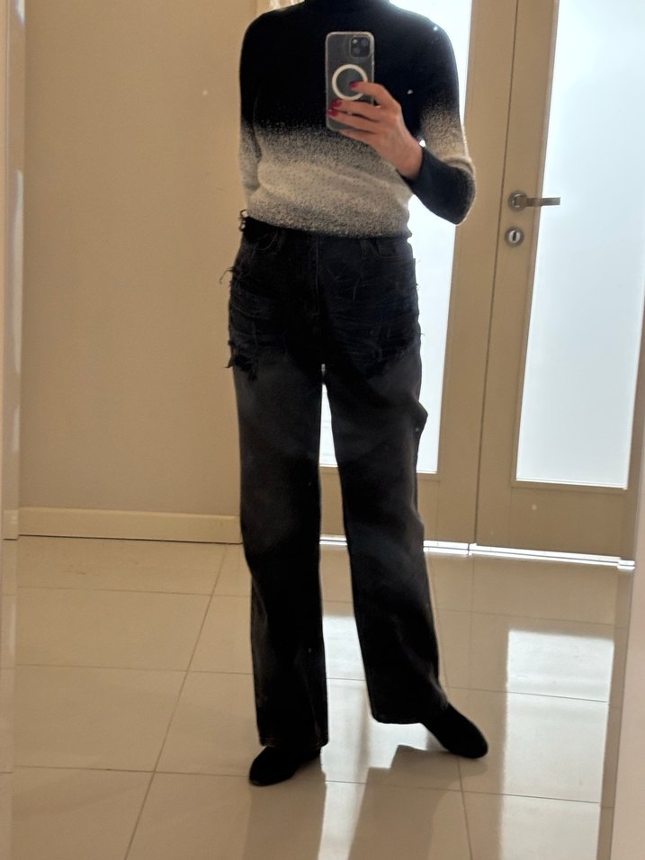 Beyazdan siyaha geçişli boğazlı vücudu saran kazak. m beden olmasına rağmen S beden uyumlu