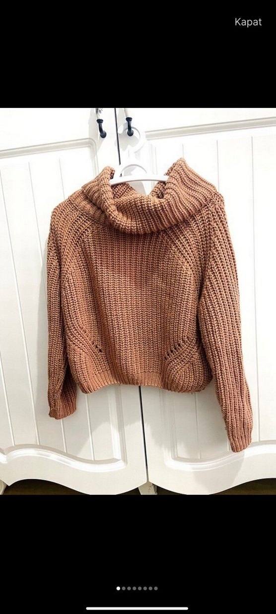 Kahverengi örgü kadın kazak, boğazlı ve bol kesimdir. Uzun kollu, midi boyda olup rahat ve gündelik sokak stiline uygundur. Pastel tonları ve desensiz tasarımıyla şık ve konforludur.