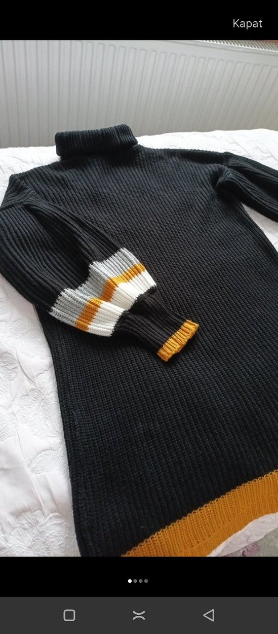 Boğazlı, uzun kollu, siyah triko kazak, renkli manşet detayları ve midi boyuyla rahat ve şık bir sokak stili sunar.