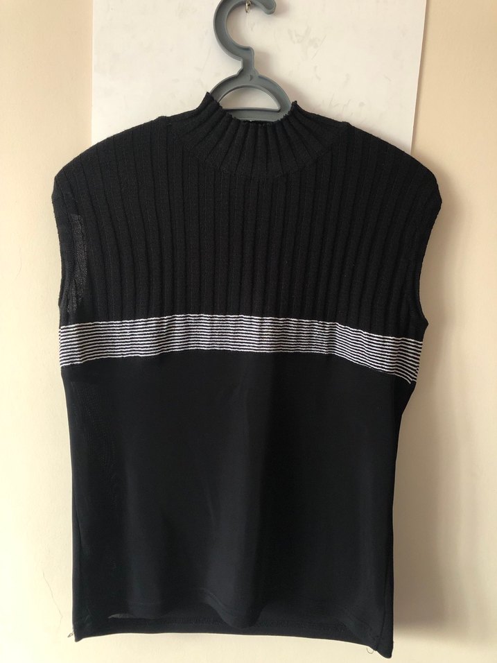 Boğazlı, göğüs kısmı triko alt kısmı esnek kumaşa sahiptir. Kolsuz siyah triko kadın bluzu. Birkaç kez kullanıldı. Hiçbir kusuru yoktur.