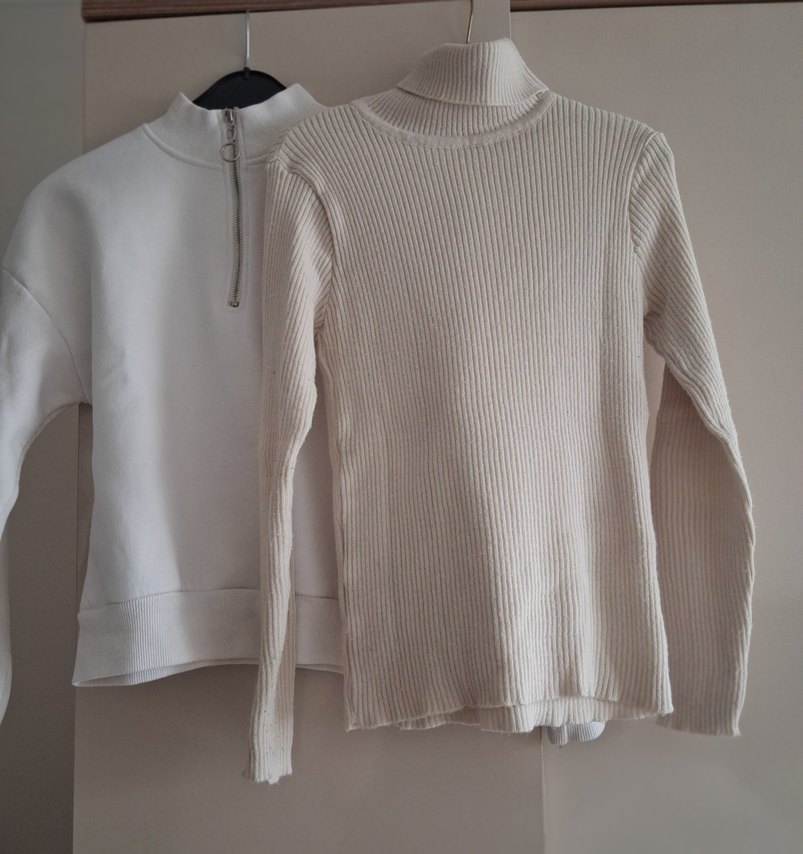 Yumuşak triko kumaştan üretilmiş, yüksek yakalı ve uzun kollu, vücuda oturan beyaz kadın kazak. Rahat ve sade tasarımı günlük kullanıma uygundur.