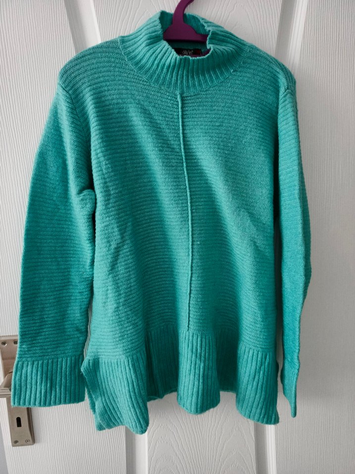Turkuaz renkte, boğazlı ve uzun kollu, rahat kesimli triko kazak, günlük kullanıma uygun konforlu bir tasarıma sahiptir.
