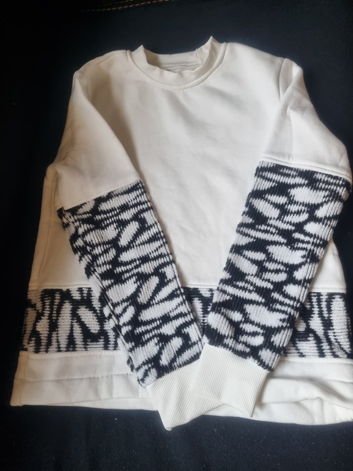 kız çocuk için uzun kollu, siyah-beyaz örgü desenli kollara sahip, boğaz yaka ve salaş kesim beyaz kısa uzunlukta sweatshirt. Sokak stili ve athleisure tarzını birleştirir.