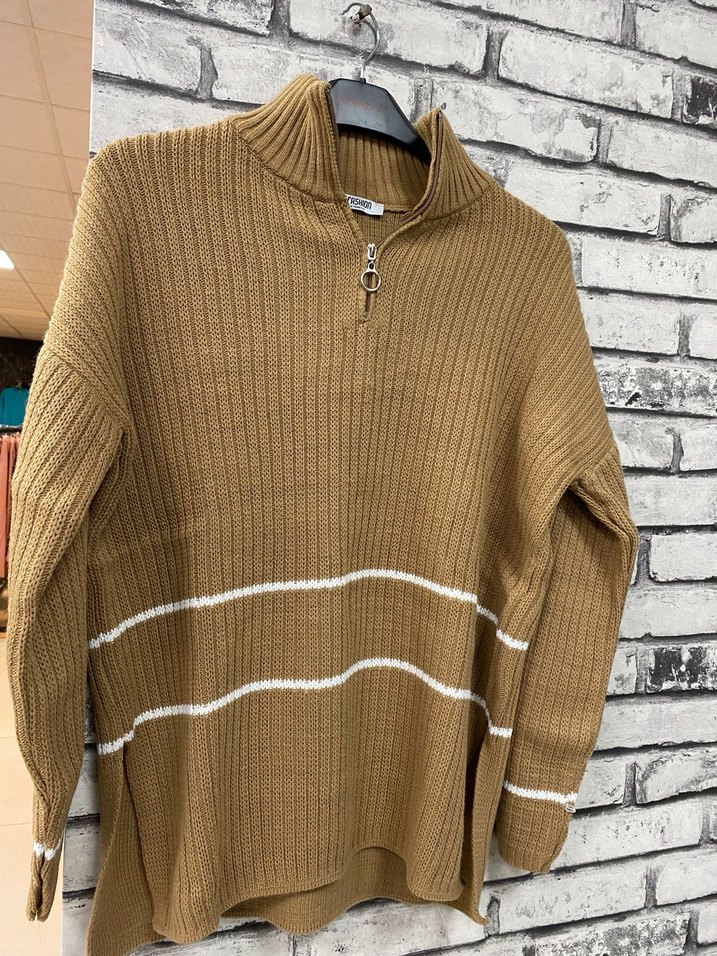 Kahverengi triko kazak, boğazlı yarım fermuarlı, uzun kollu ve bol kesimlidir. Normal boyda, beyaz ince çizgilerle günlük sokak stiline uygun rahat bir parçadır.